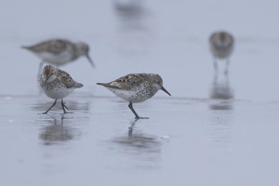 The Sanderlings were maybe 50% larger than the Western Sandpipers. I took a bunch of shots of them to help confirm the ID, and when I got home I learned that they lack the hind toe that other peeps have, and some of my photos clearly showed this field mark. As I processed the photos over the last few days I became able to recognize them at a glance: their heads are relatively small compared to Western Sandpipers'.