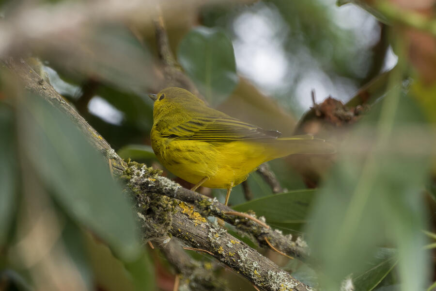Yellow WarblerThis bird is yellow and without many other field marks. That I think indicates Yellow Warbler. I looked at photos of Orange-crowned Warbler as well, but those don't have the yellow color extending all the way to the tip of the under tail like this bird does, and the bill doesn't quite look pointy enough. I am pretty confident this is a Yellow Warbler.