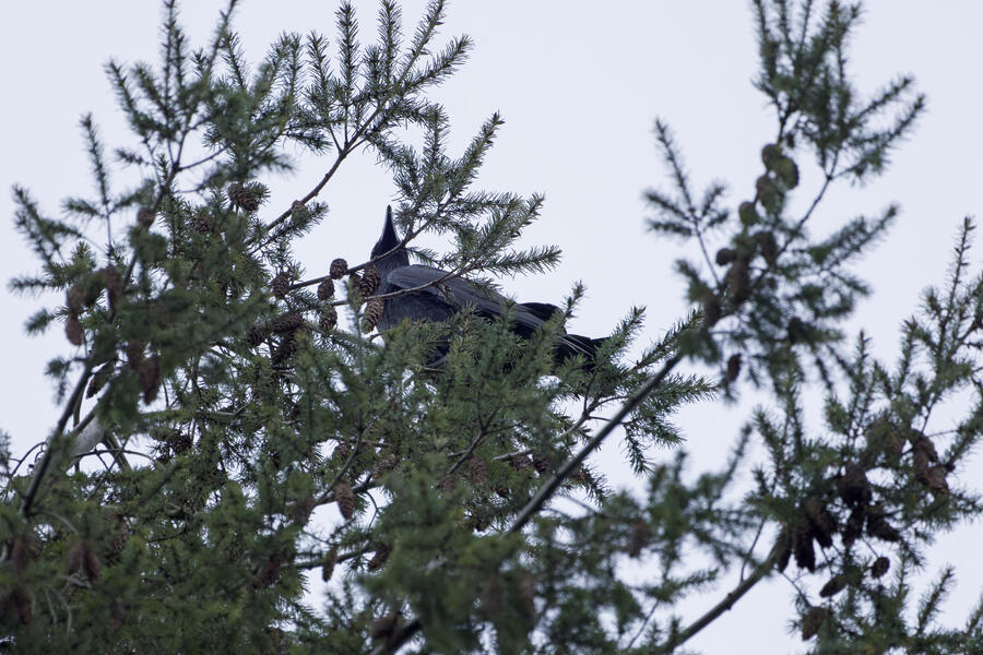 I also added another bird to the yard photos list: Common Raven. I've heard them well overhead a few times from the yard lately, but this time one spent a while squawking from the top of a tree and I was able to photograph it.