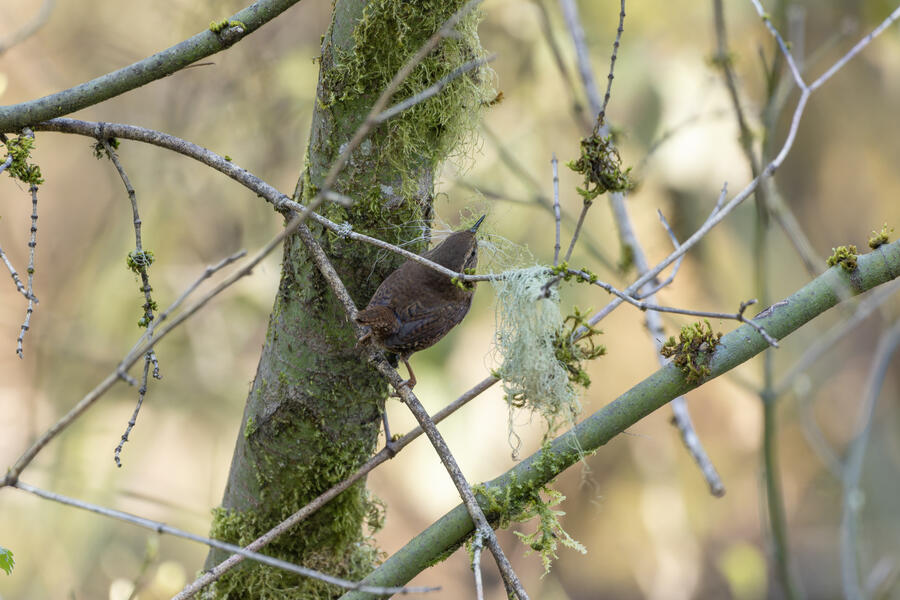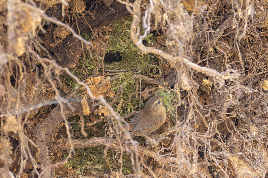 Pacific WrenAccording to Cornell Lab's Birds of the World, males build nests but females often help line the nests before laying eggs. It was unclear whether the nesting material being gathered here was for building or lining, so it's unclear whether I was watching a male or female.
