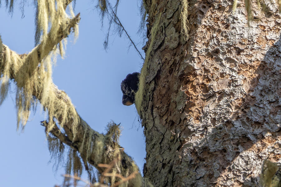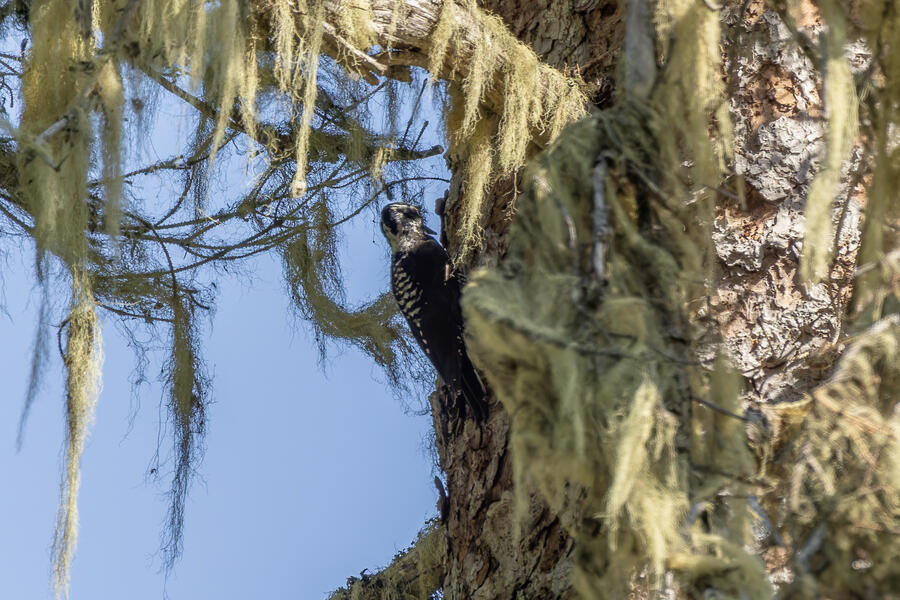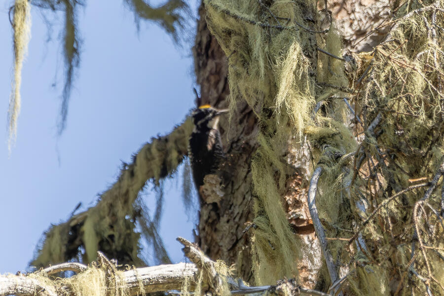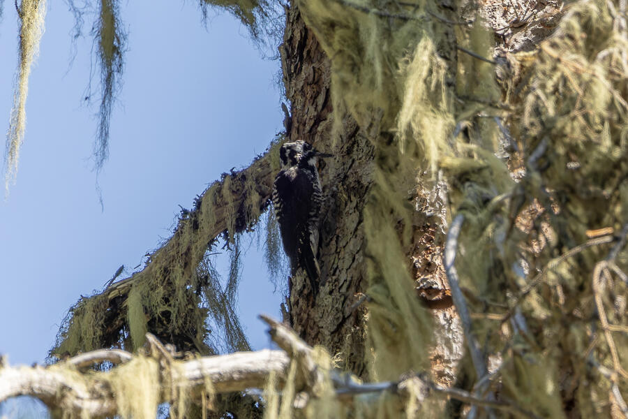 Farther down the trail, I had again stopped to listen and heard very faint woodpecker drumming noises. I found the tree where the sound seemed to be coming from, but couldn't see it. As I waited there for a few minutes, I saw pieces of bark falling — but still couldn't see it. I walked up and down the path a little to try to peer around to different sides of the tree, but had no luck. Finally, a little dark woodpecker climbed up into view. The light wasn't great, so even with my binoculars and scope I couldn't tell exactly what I was looking at. The photos show clear white barring on the back and a yellow cap: American Three-toed Woodpecker!