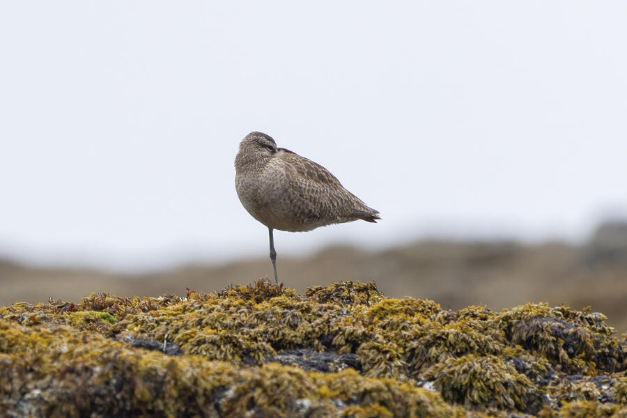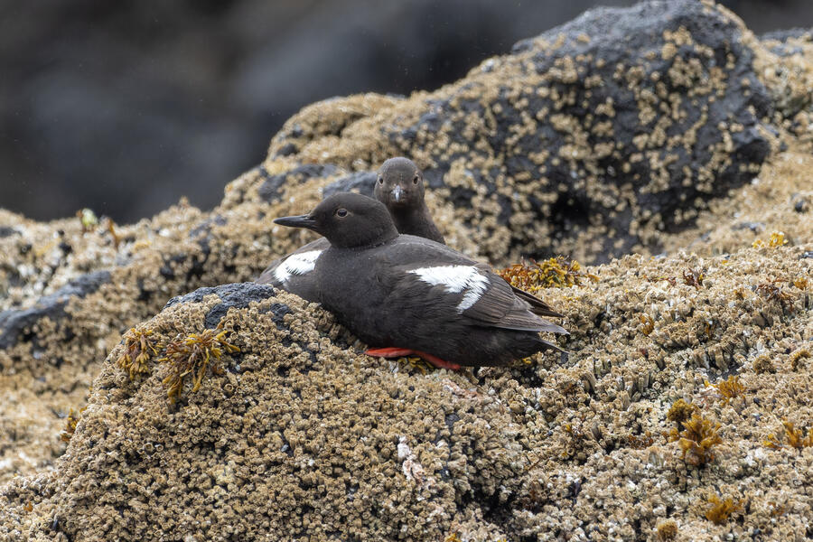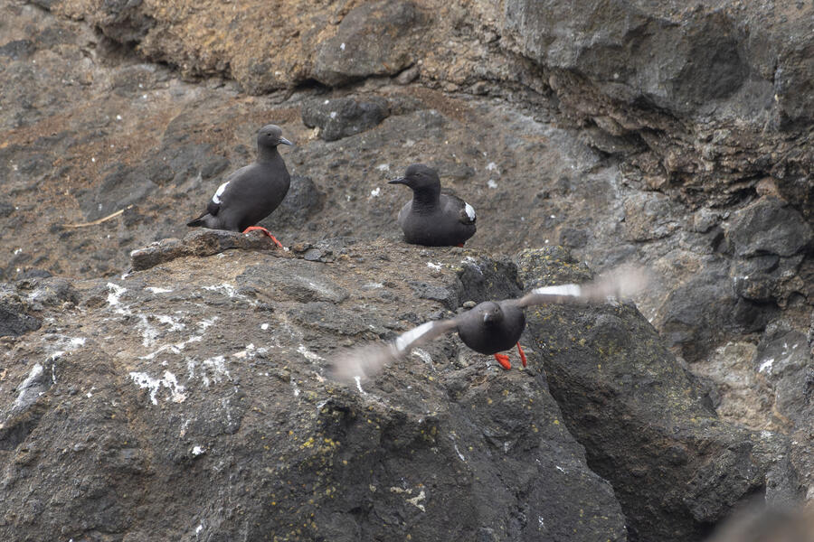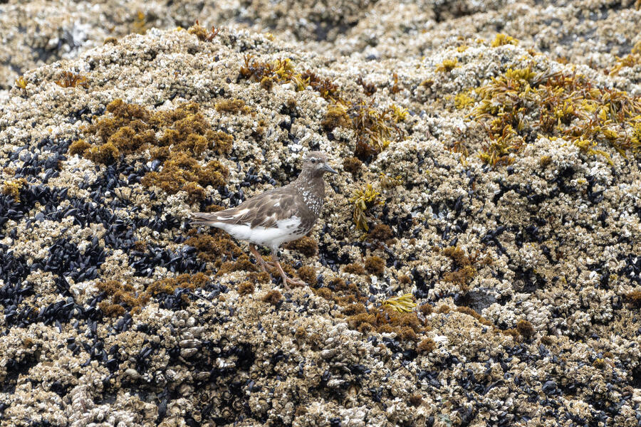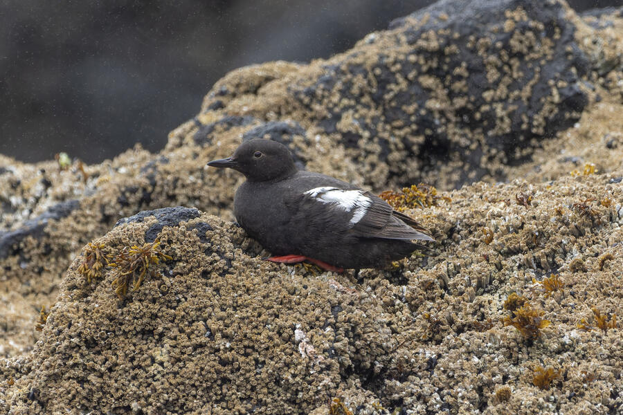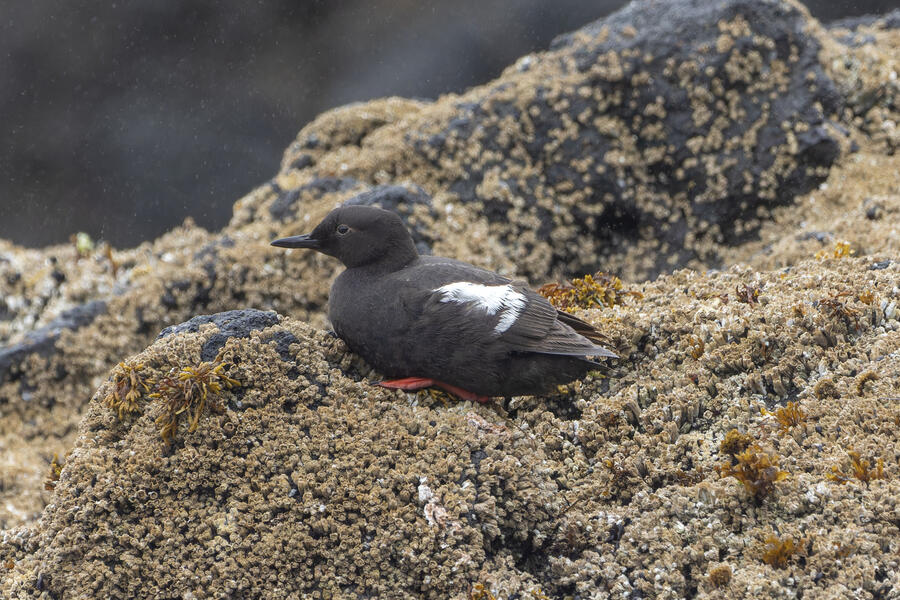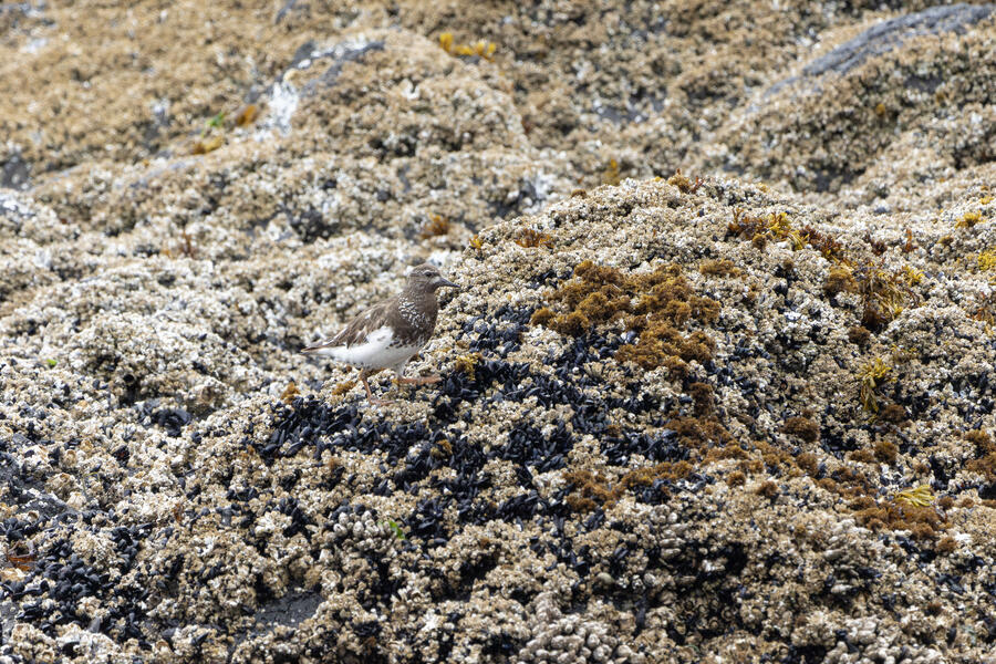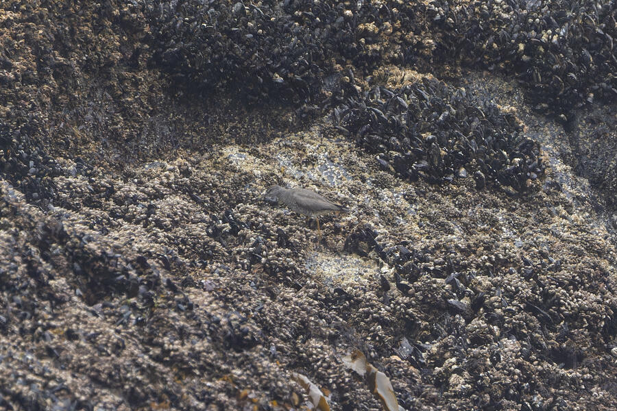 Due to favorable weather conditions, I drove to the coast on the next day. The tops of some huge towering sea stacks held a few hundred Murres, Gulls, and Cormorants. Down below, there were some birds down closer to eye level too. I walked along the beach right up to the rocks. There were plenty of other people around (there always are) so I wasn't intruding upon the birds. The longer I stood there, with the waves running up to reach my boots, the more birds I saw. Some Pigeon Guillemot were resting on the rocks, and I took the opportunity to get my best-ever shots of them. A Black Oystercatcher was breifly visible. I noticed a smaller bird blending right into the rocks in front of me: Black Turnstone. After enjoying the atmosphere for a while, I was about to turn around and leave when I saw another pair of brownish wings flutter against the rocks. I thought it was probably another Black Turnstone but when I looked with my bincoulars it appeared to be a lifer Wandering Tattler! It was a bit far away, and hard to see, but I recognized its shape. The photos I got aren't great (better than I expected) but plenty good to confirm my sighting.