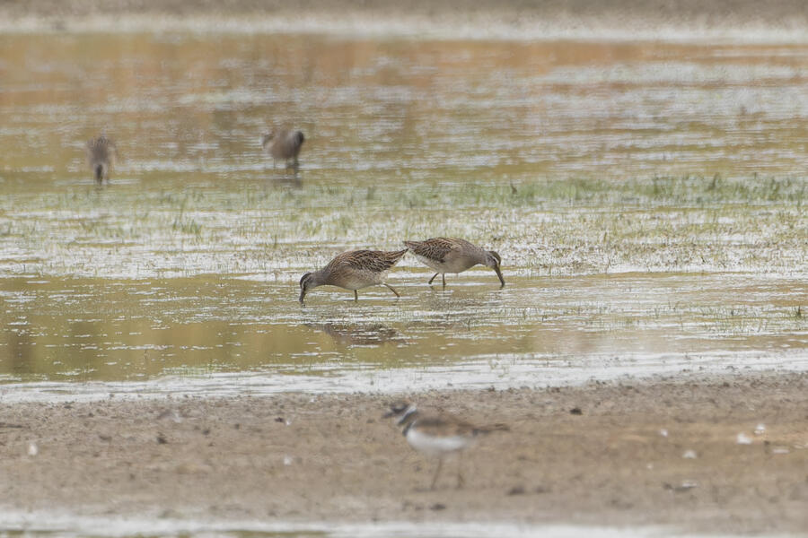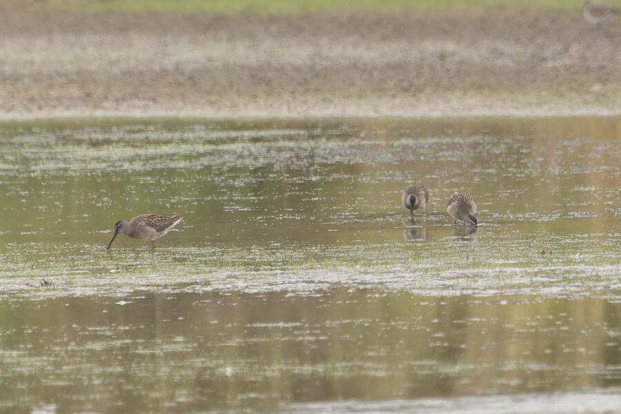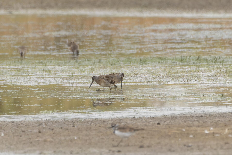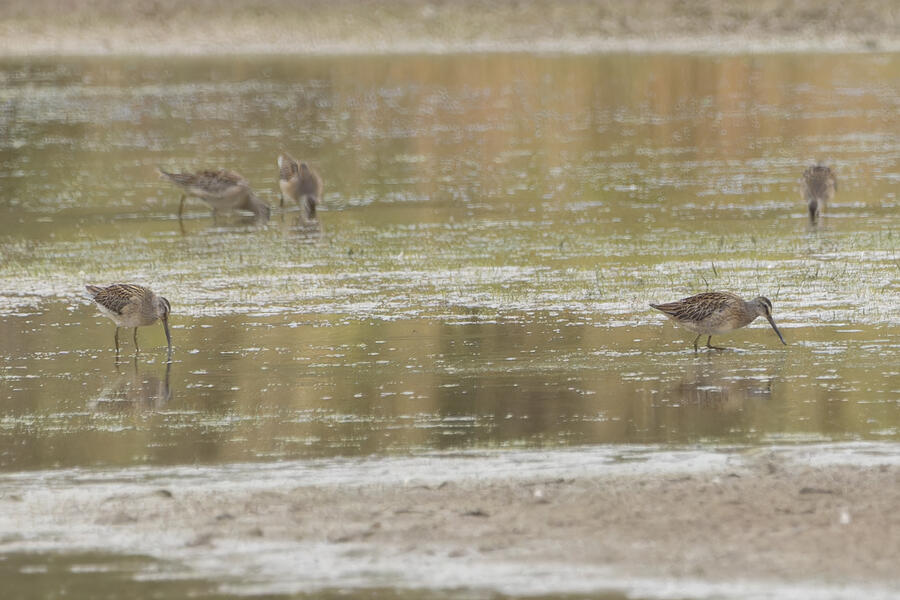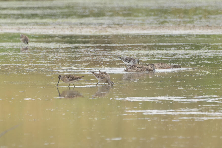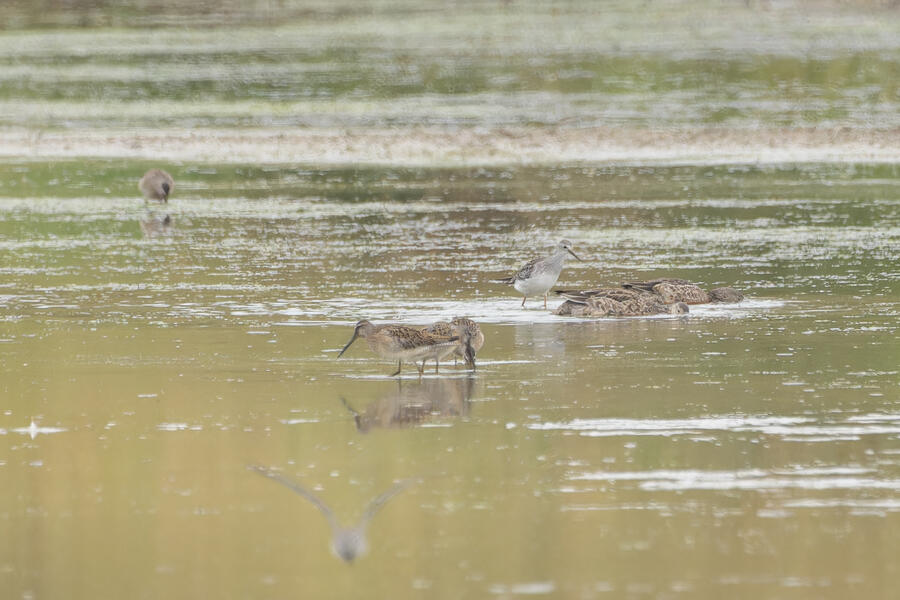 Next, after several tries over the last few years I finally was convinced I saw my lifer Short-billed Dowitchers. I knew that juveniles are pretty much the only ones that can be easily distinguished visually from Long-billed's, and I knew that juveniles are known to move through this area at this time of year. I saw what looked through the scope like a bunch of juvenile Short-billed with their orange-outlined tertial feathers with the telltale orange central stripe down the middle. They were pretty far away, unfortunately, and in the photos only a few of them have the clear orange central stripe on the tertials. Though I hoped for better photos, I'm glad I finally found a small group of Short-billed's.