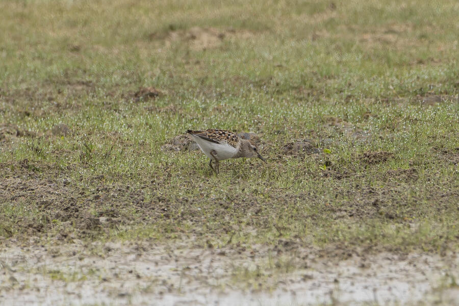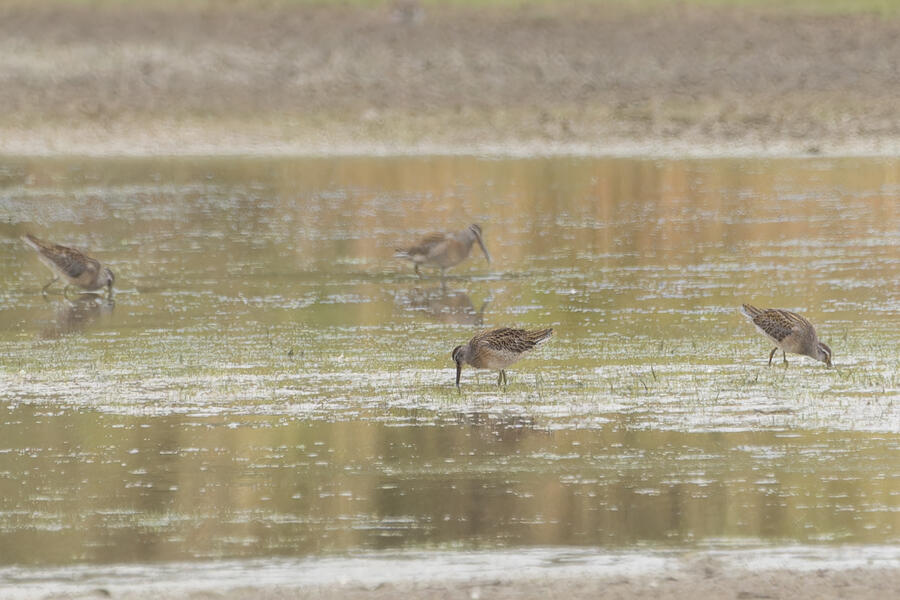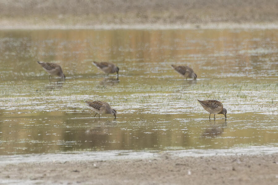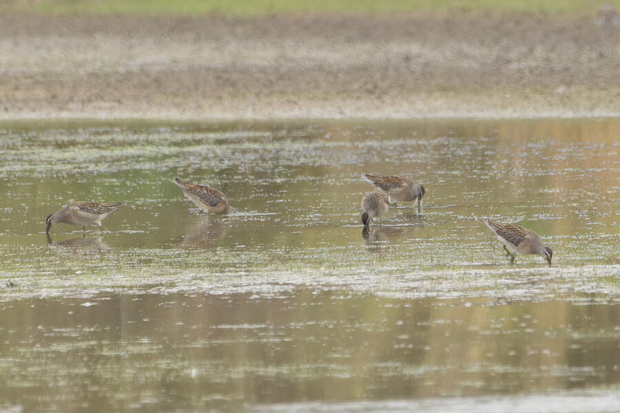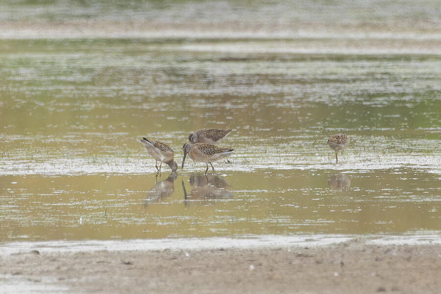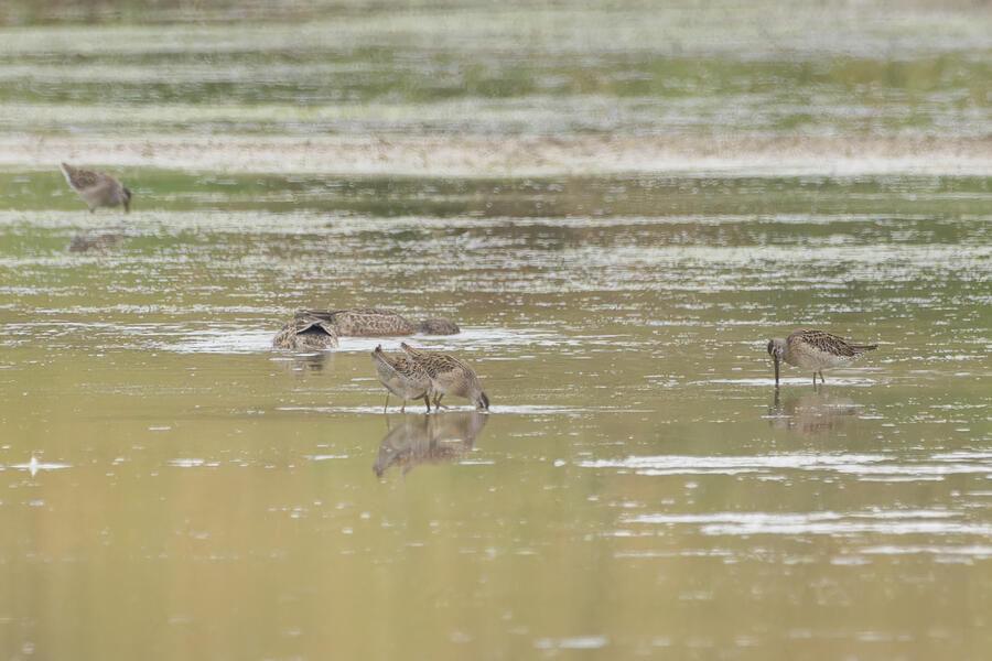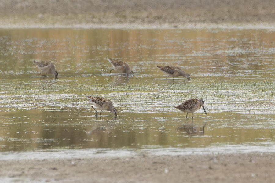 Next, after several tries over the last few years I finally was convinced I saw my lifer Short-billed Dowitchers. I knew that juveniles are pretty much the only ones that can be easily distinguished visually from Long-billed's, and I knew that juveniles are known to move through this area at this time of year. I saw what looked through the scope like a bunch of juvenile Short-billed with their orange-outlined tertial feathers with the telltale orange central stripe down the middle. They were pretty far away, unfortunately, and in the photos only a few of them have the clear orange central stripe on the tertials. Though I hoped for better photos, I'm glad I finally found a small group of Short-billed's.