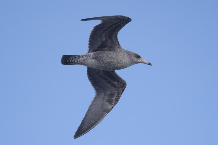 1st-cycle California Gull. Bill is long and straight, too long for Ring-billed, without enough of a bulge at the gonys for a Western/Glaucous-winged/Herring. Prominent gape. The pale tips of the tail feathers is visible. The eye is not beady enough (too large relative to head) for Western. Overall color is too dark for Ring-billed.