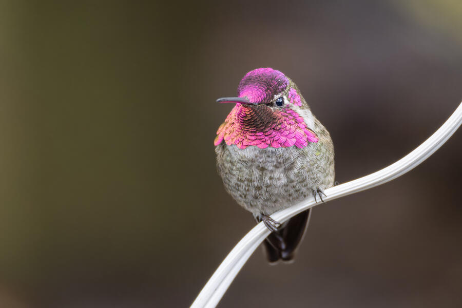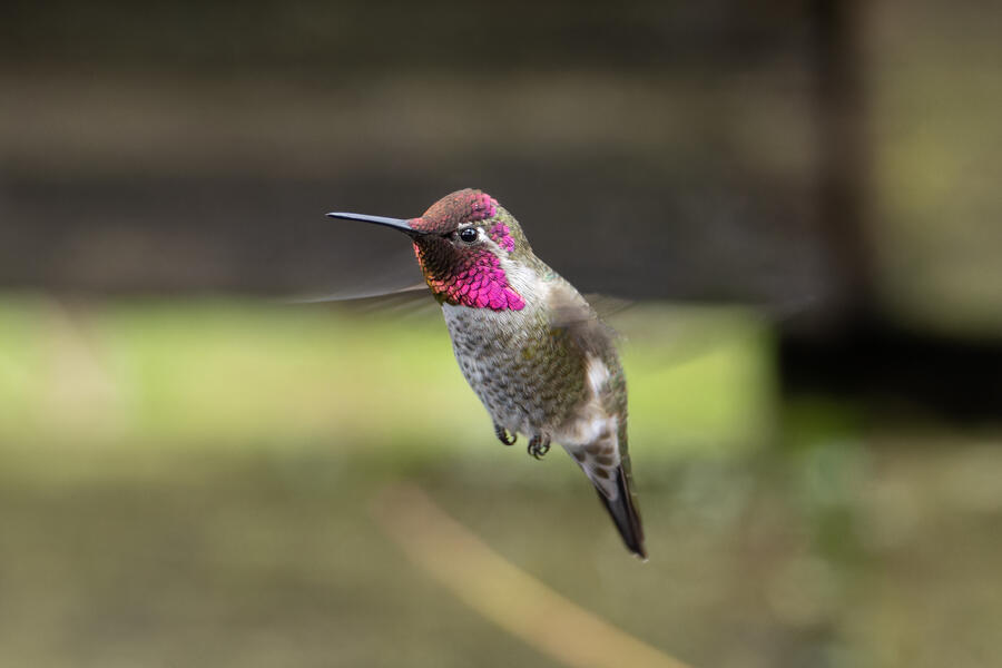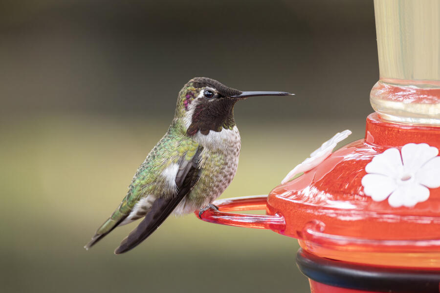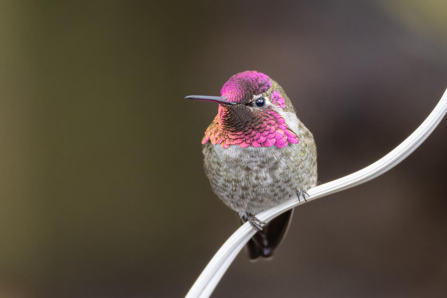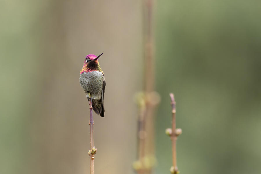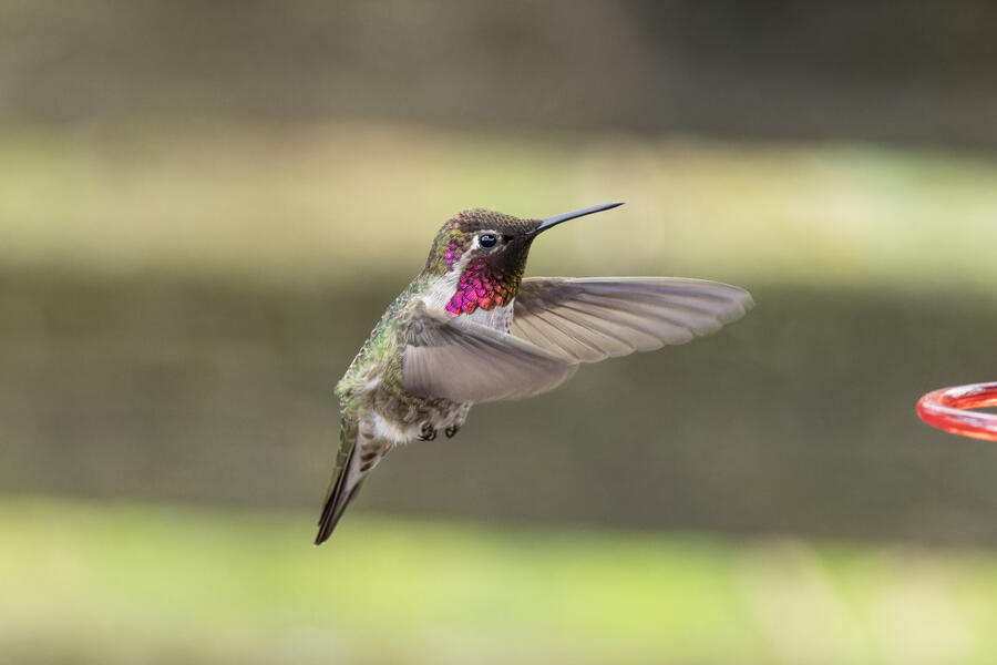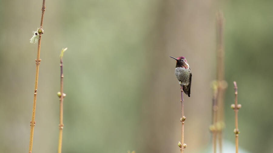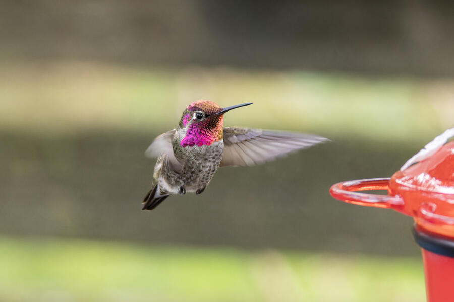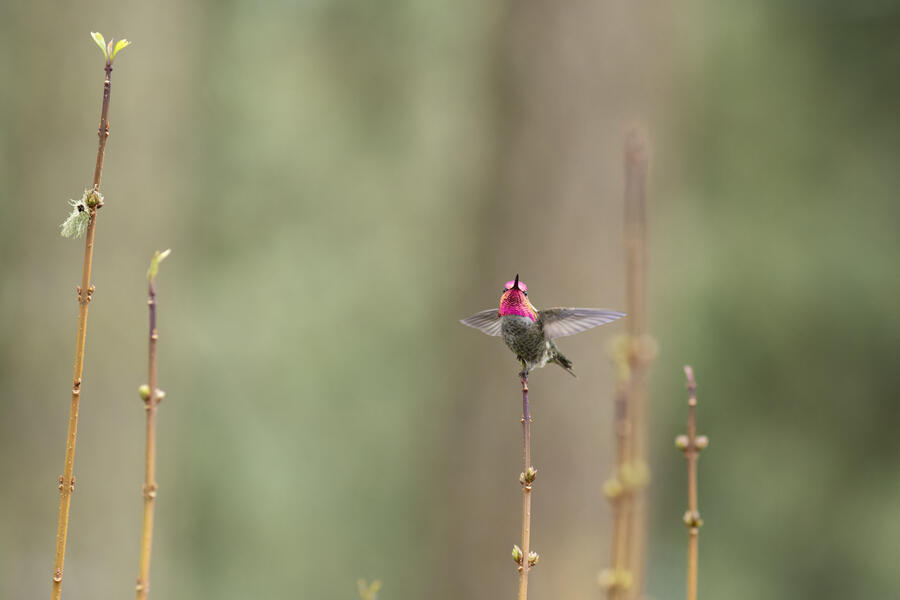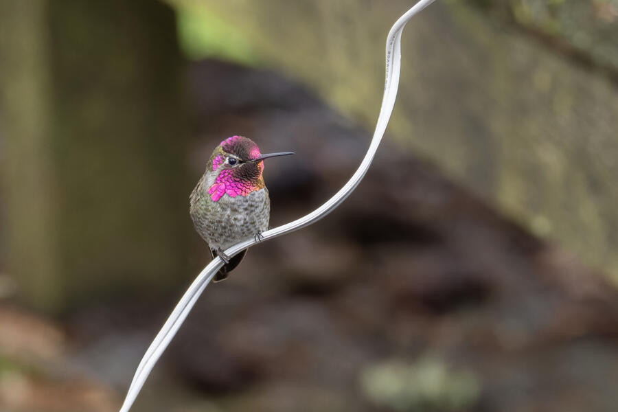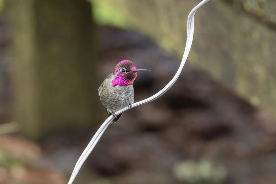 A male Anna's Hummingbird has been consistently appearing at the feeder for the last few weeks. I was able to get pretty close to the shots I wanted after waiting for a while near the feeder. I used my reglar f/9 zoom lens, but it was kind of a dark afternoon. I also experimented with a 200m f/2.8 lens since I was able to get pretty close without bothering him. The faster aperture definitely allowed for a lower ISO: the shots of him hovering near the feeder were shot at ISO 4000 with the zoom lens (at f/6.3) and ISO 2000 with the prime lens (at f/3.2). While waiting for him to fly down to drink or perch I was surprised to see a second male Anna's appear and get chased away. Because they appear to have different preferred perches, and I'd been seeing them on both, I guess I had been seeing two separate individuals at the feeder.