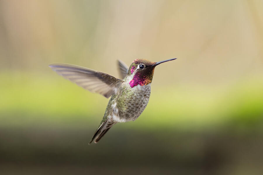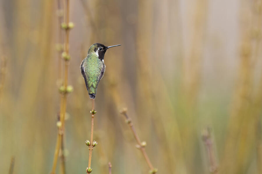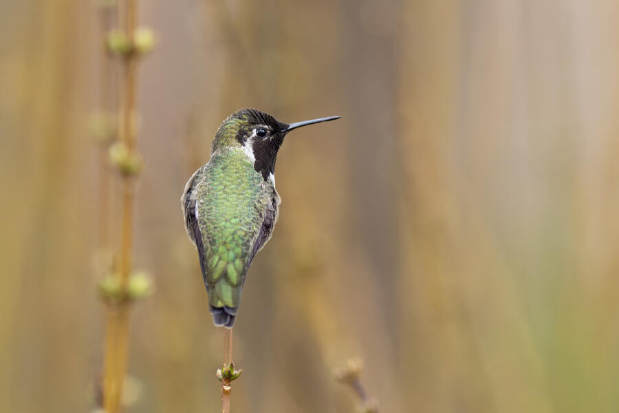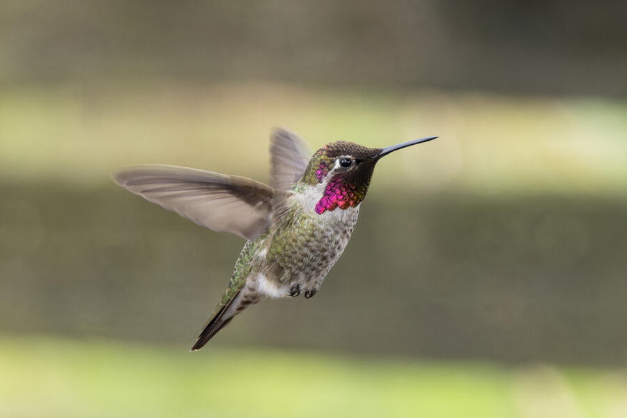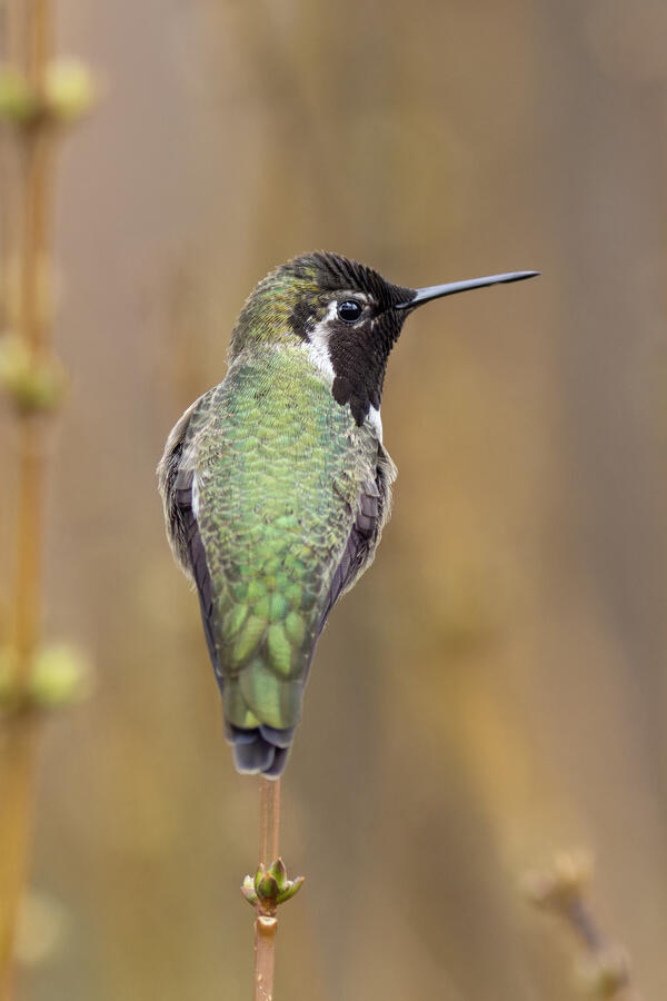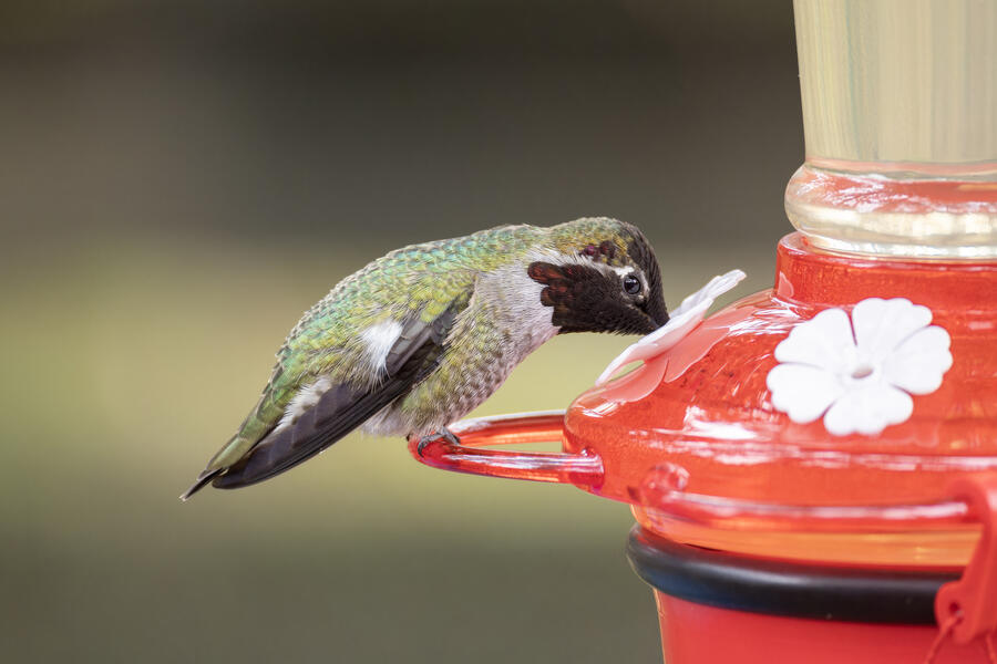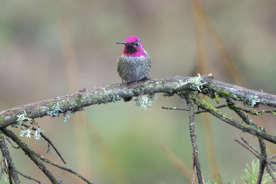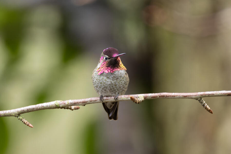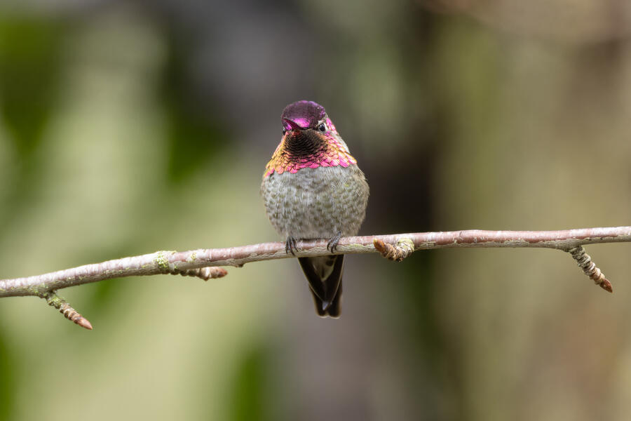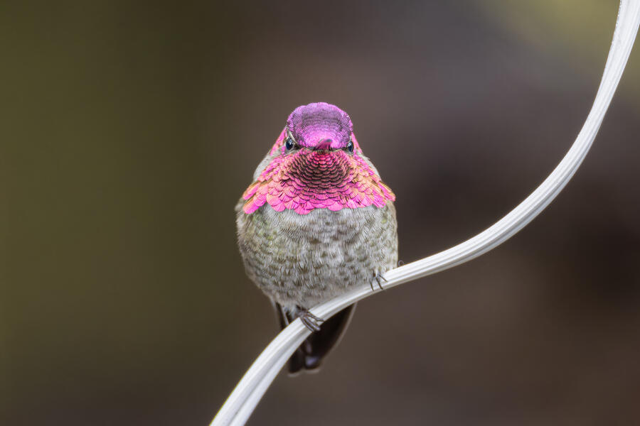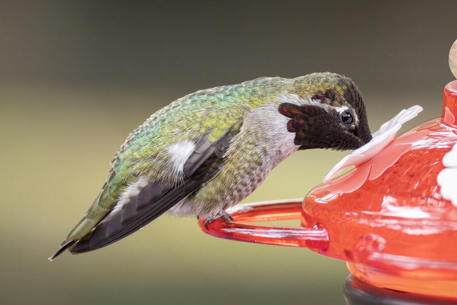 A male Anna's Hummingbird has been consistently appearing at the feeder for the last few weeks. I was able to get pretty close to the shots I wanted after waiting for a while near the feeder. I used my reglar f/9 zoom lens, but it was kind of a dark afternoon. I also experimented with a 200m f/2.8 lens since I was able to get pretty close without bothering him. The faster aperture definitely allowed for a lower ISO: the shots of him hovering near the feeder were shot at ISO 4000 with the zoom lens (at f/6.3) and ISO 2000 with the prime lens (at f/3.2). While waiting for him to fly down to drink or perch I was surprised to see a second male Anna's appear and get chased away. Because they appear to have different preferred perches, and I'd been seeing them on both, I guess I had been seeing two separate individuals at the feeder.