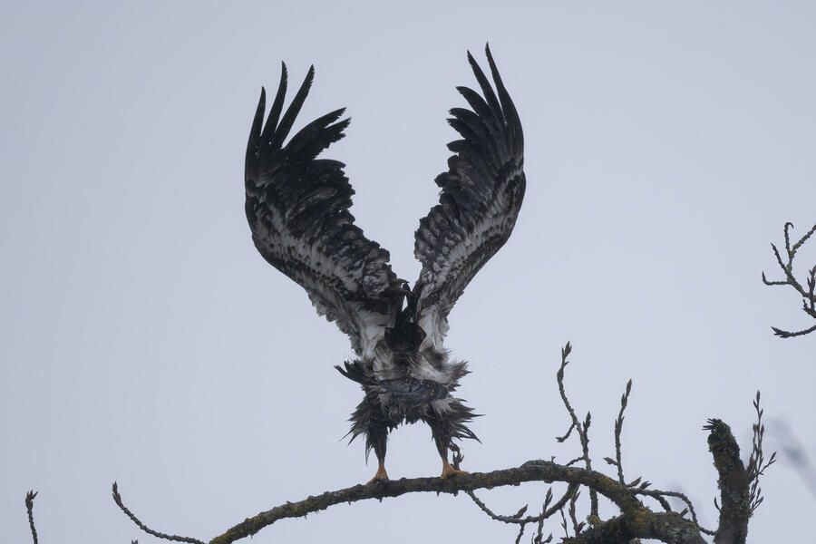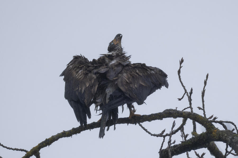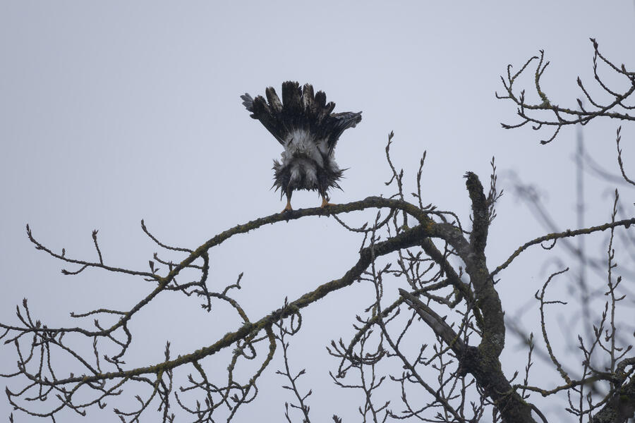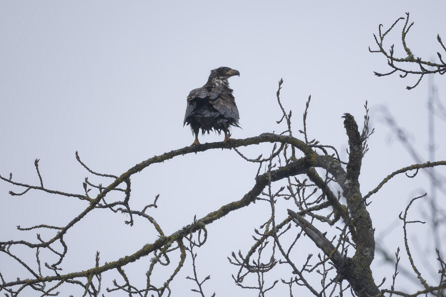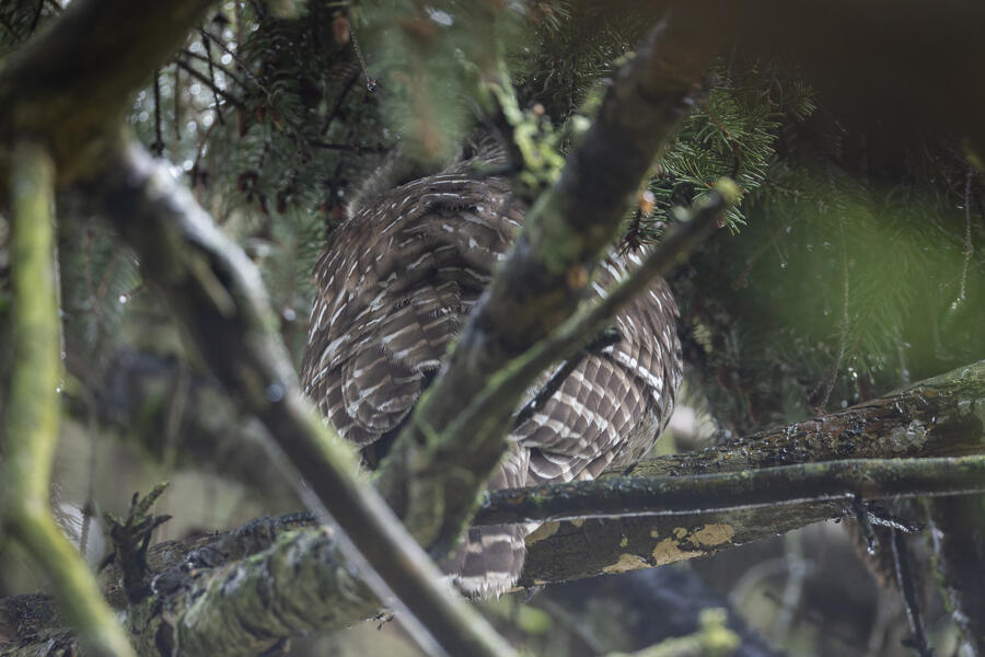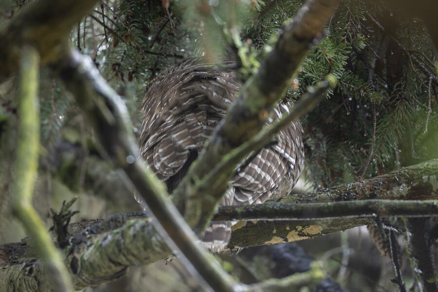 A local birder told me the location of a Barred Owl, so I went out in the rain to try to find it. Even when knowing where it was, it would be easy to overlook. After finding the owl, I used silent shooting mode on my mirrorless camera and took only a few shots before stepping away. I was looking up at the owl from underneath, so it wasn't worth waiting for a good shot anyway. I spent a few minutes after that trying to get a view of it, and perhaps its face, from farther away. After walking all around the tree and lots of scanning with binoculars I wasn't able to get a view of it. I wonder how many owls I've walked right by without knowing.