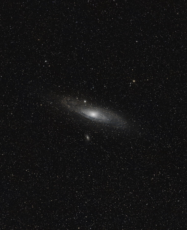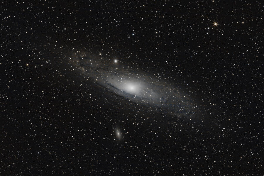 I again shot M31 Andromeda at f/3.5 on the EF 200 f/2.8 L II. This is a stack of the best 472 of 517 lights. Each light frame was an 18s exposure, so this image represents 1.97 hours of data. By previous best M31 image, from a recent gallery here and on astrobin, was made from 53 minutes of data. The extra hour did reduce noise, and since I took so many light frames and the galaxy was drifting a bit in the frame across the session, I figured I should try Siril's 2x drizzle feature. That did seem to help bring out even more fine detail in the image. After I make another post to astrobin I'll provide a link here for more details and a full-size image.