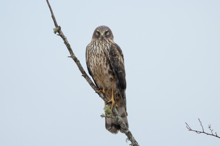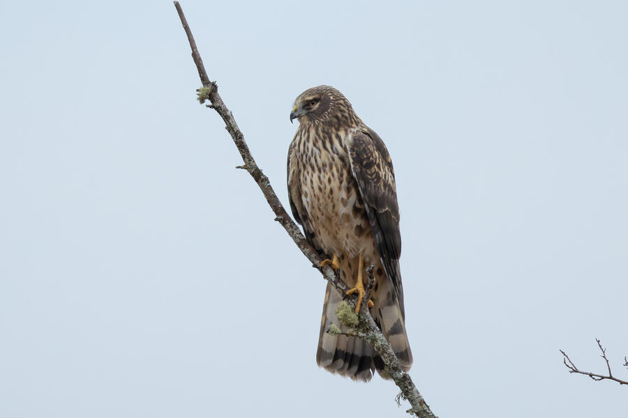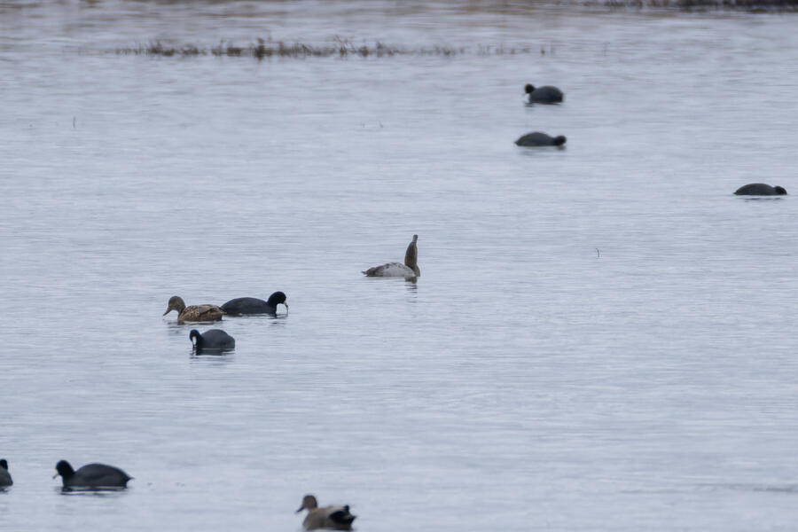 The Canvasback was a tricky duck to pick out from among a couple hundred ducks, mostly because the Ruddy Duck has a similar bill profile from a distance, and because she kept diving down out of sight. On the walk out to the ponds I took a bunch of photos of a talkative perching Northern Harrier.