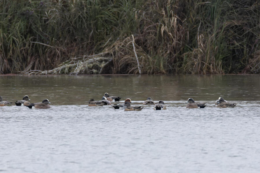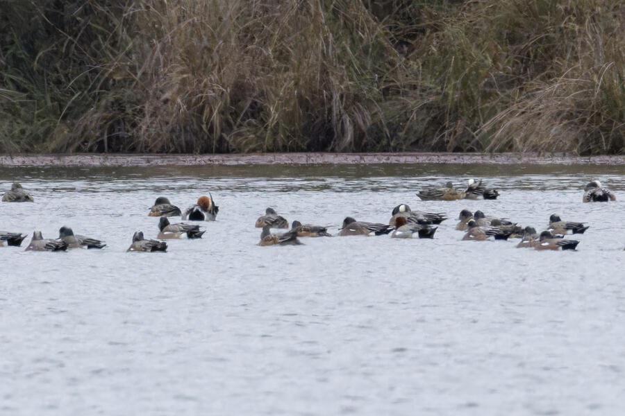 Eurasian Wigeon, American WigeonThis male Eurasian Wigeon was so far away that it was challenging to find him in the viewfinder. When editing the this photo I noticed it looks like there were two of them!