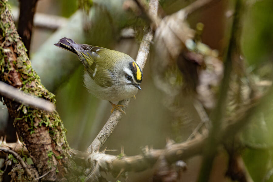 Golden-crowned KingletI spent a few minutes trying to photograph some eye-level Golden-crowned Kinglets. I didn't have much luck. These two photos were the best but there was some vegetation in the way in the foregound, causing a large area of the photos (including the bird) to be a bit soft and green-tinted. I was able to fit them somewhat with dehaze, tint, and temperature adjustments in Lightroom Classic. I'll keep trying for a clear eye-level picture of these guys!