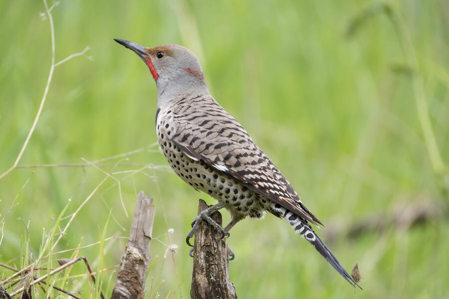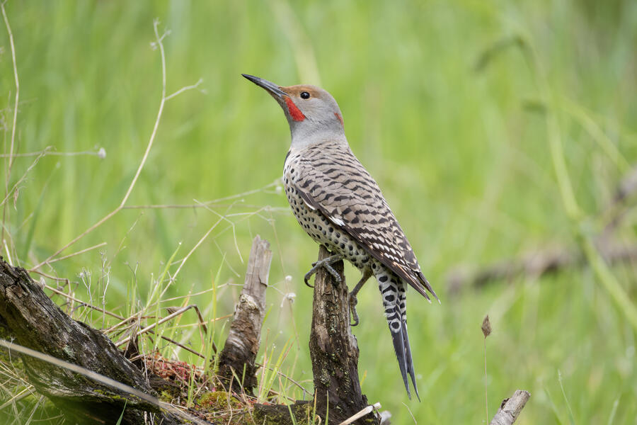 Northern Flicker (Yellow-shafted x Red-shafted)This male hybrid flicker held a nice pose for me for a minute and gave nice profile shots and well as a clear shot of his semi-red nape area.