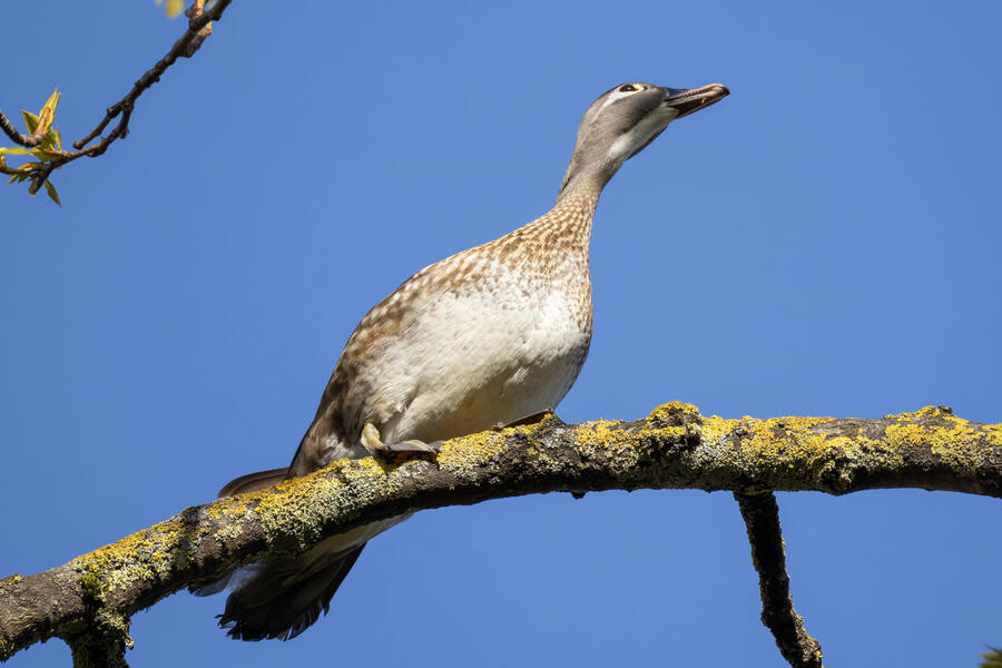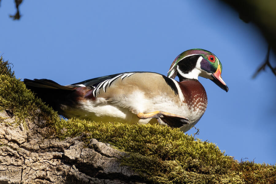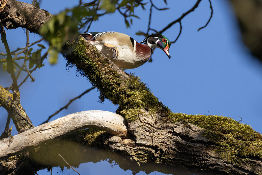 Wood DuckI saw a big thing in a tree, and my eyes couldn't make sense of what it was. After a look with binoclulars I was surprised to see a female Wood Duck above my head! I saw the male soon afterwards, and stepped away from a tree to get a better angle for a photo. I didn't see any nest cavity, and they were walking around quite a bit, perhaps exploring a few trees.