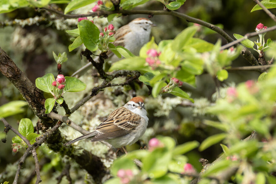 Chipping SparrowI heard a couple of Chipping Sparrows earlier in my walk, but wasn't able to spot them. I was really happy to unexpectedly see this pair just appear in a tree right in front of me!