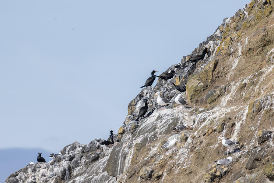 Western Gull, Double-crested CormorantThis is a distant shot, but it shows some nesting Double-crested Cormorants, and some perhaps-nesting Western Gulls.