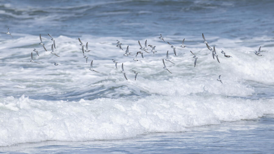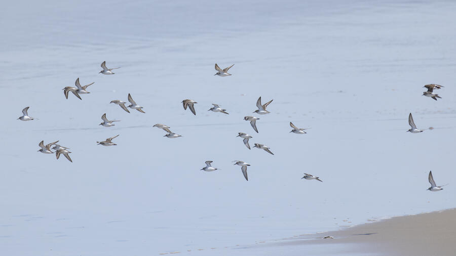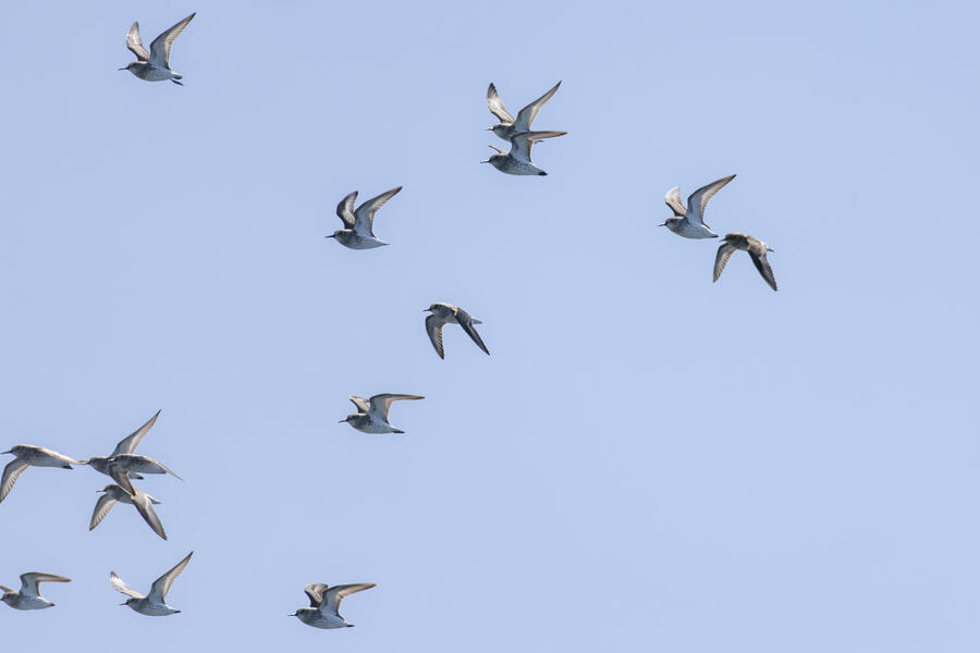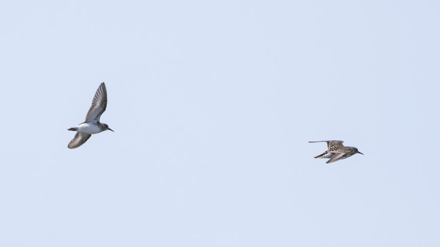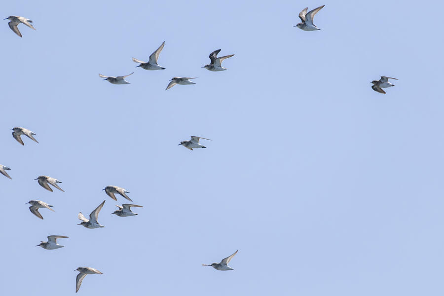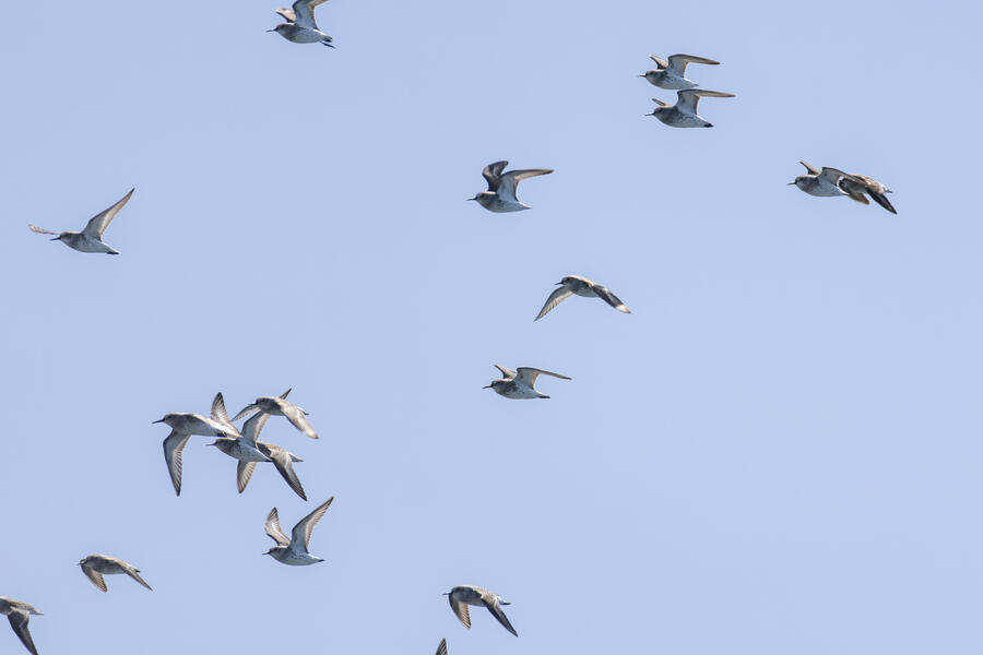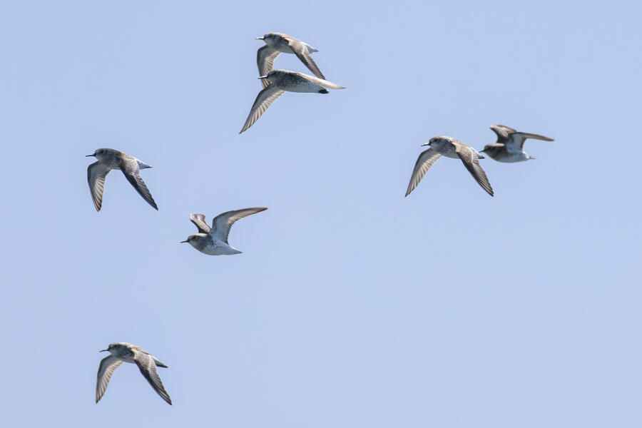 Western SandpiperThe right-most bird looks like a Least Sandpiper, but the rest are Western Sandpipers: they have slightly longer bills and brown triangle spots going farther down their flanks.
