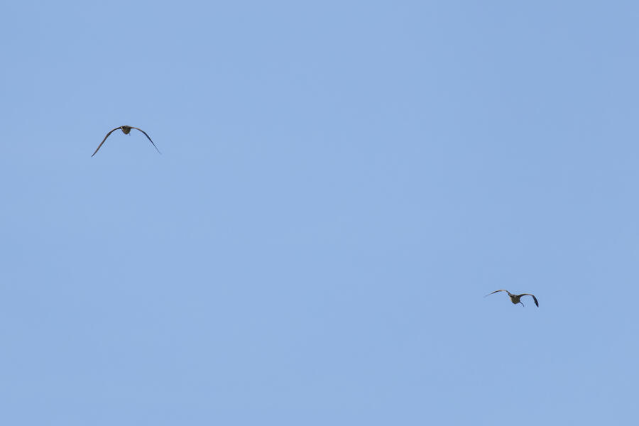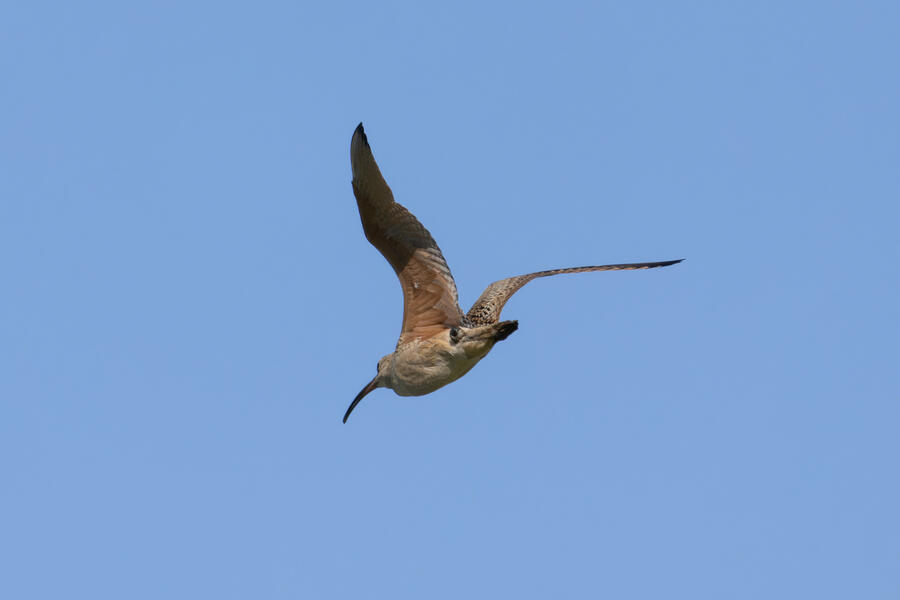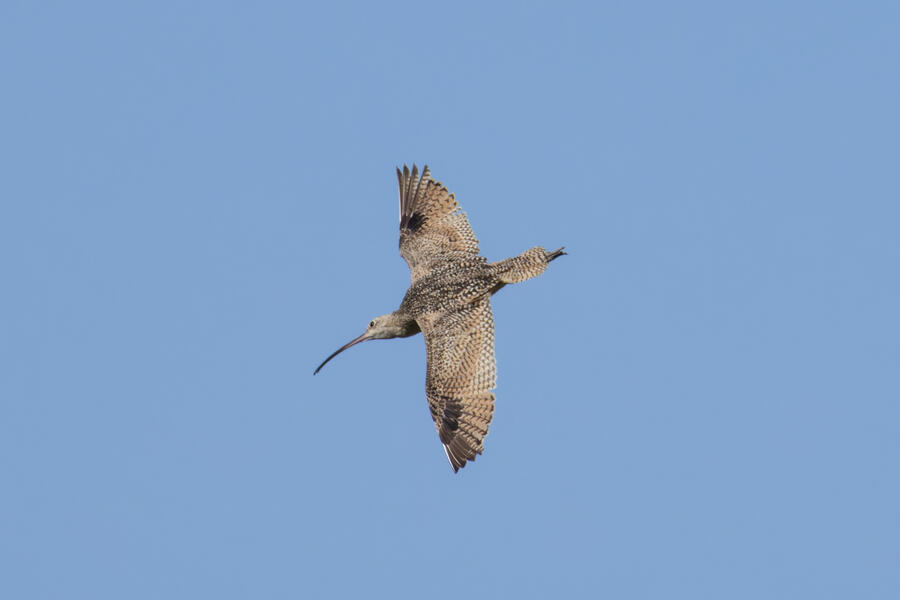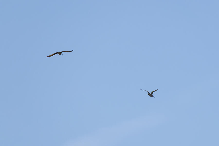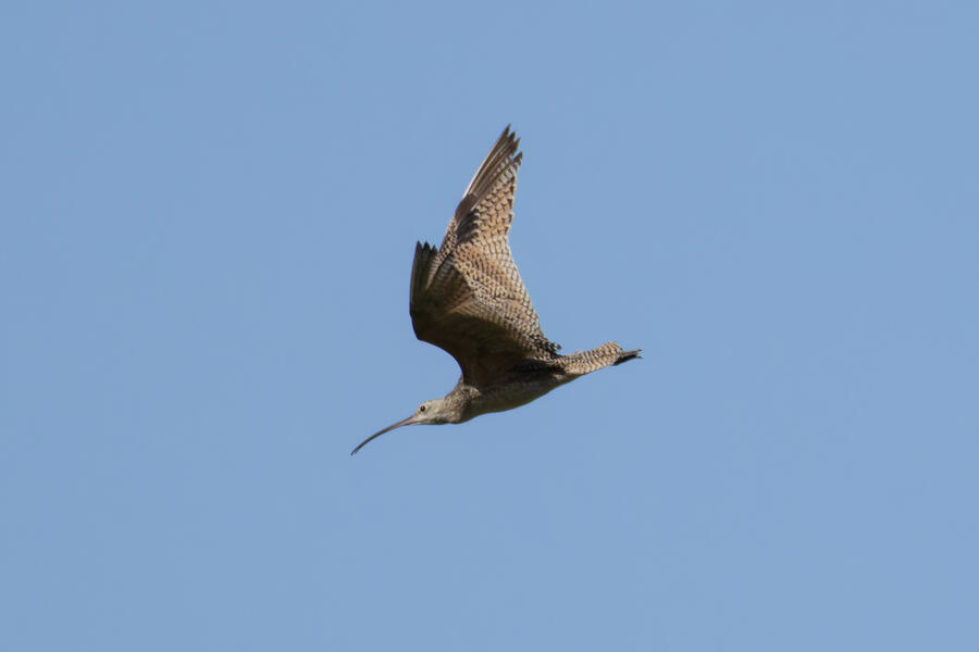 Shorebird season continues! I went out looking to see a rare Long-billed Curlew in the late afternoon. It had been reported all day by many people, so I thought my chances were pretty good. After a mile walk in the heat, I was somehow unable to see the large bird on the mudflats where I expected it to be foraging. As I was standing there entering something into my eBird checklist on my phone I heard loud cries of what sounded a bit like a gull. The calls took a few seconds to register in my brain, but then I had my camera up and began shooting photos of a pair of large birds flying off. Luckily, they briefly came back toward me before heading off for good. They must have been Curlews, but there were two of them! Nobody else had reported more than one all day. After double-checking my audio recording, and photos on the computer, it was definitely a pair of Long-billed Curlews. I would have loved to have watched them foraging on the ground for a while, but I guess it was fortuitous that I was present when they flew off (and that I was able to report two of them). The mudflats were surrounded by lots of areas with tall grass, so perhaps both were able to hang out somewhere out of sight for me, while one of them was able to avoid being spotted by everyone else.