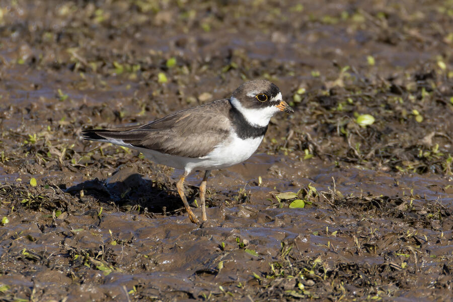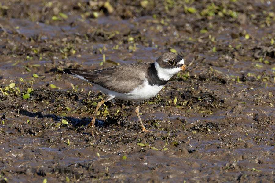 Western SandpiperDroopy longish bill and black legs. Breeding plumage adult shows reddish brown on the head and wing, and diagnostic triangular spots along flanks.
