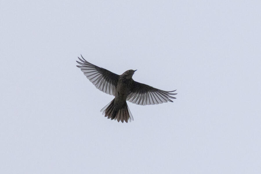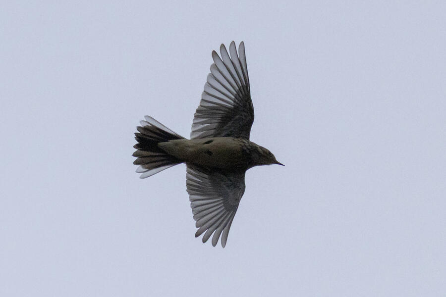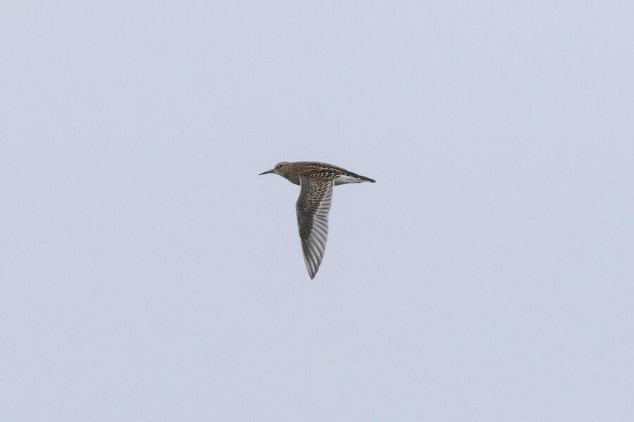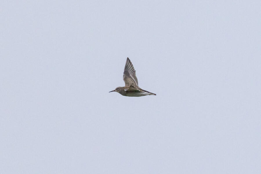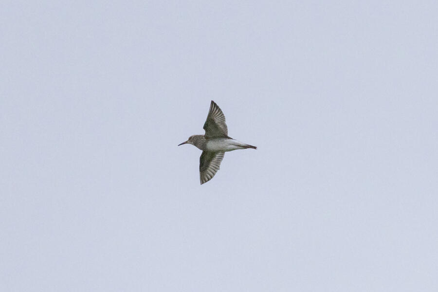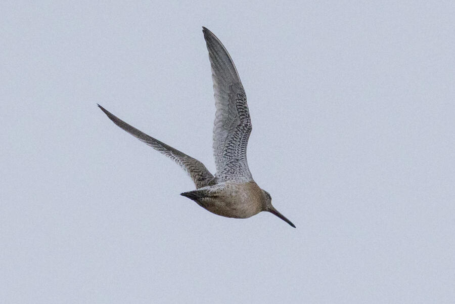 Short-billed DowitcherI heard a few distinct Short-billed Dowitcher calls as this bird flew by a couple times over a span of a few minutes. On the second flyby, I was ready and got some shots. Short-billed are pretty uncommon here (and very hard to distingish from Long-billed), so it was great to get a lone bird where I know which one it was! No barring is visible on the flanks, only light spotting. Otherwise, I'm not sure any real field marks are visible here.