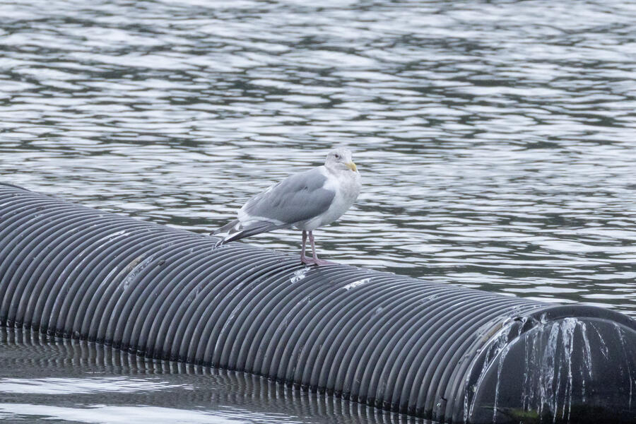 Western x Glaucous-winged Gull (hybrid)In person, the back and wingtips looked more pale gray. That lead me to believe this was an American Herring x Glaucous-Winged "Cook Inlet" gull, but the photos show a bit more color in the back and wingtips, and the bill is a bit too orange and bulbous. I've changed my mind and am calling this a Western x Glaucous-Winged "Olympic" gull.