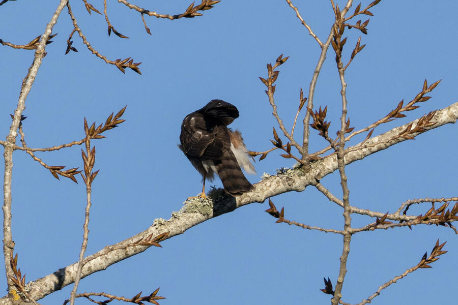 Red-tailed HawkThis hawk has many narrow bands across its tail, which looks to be a good field mark for immature Red-tailed.