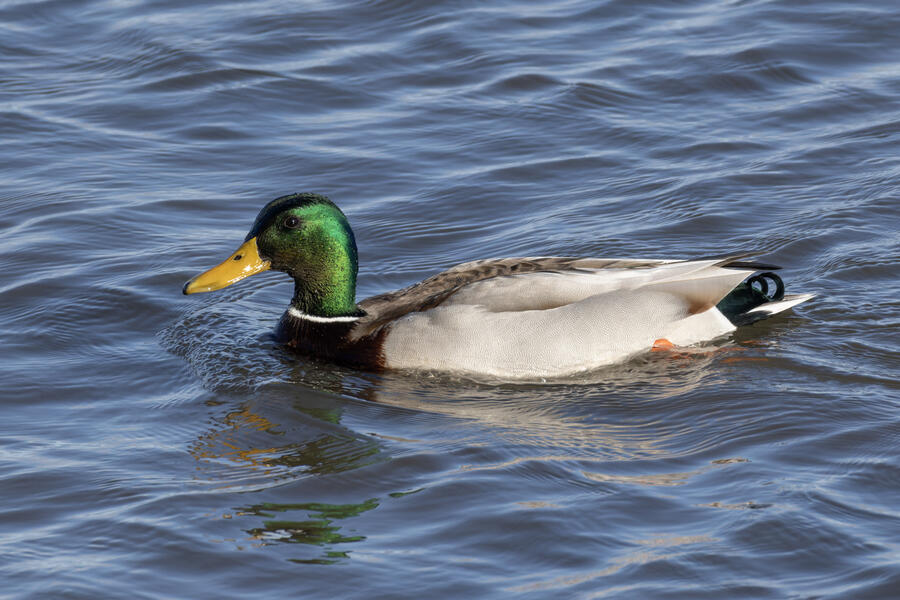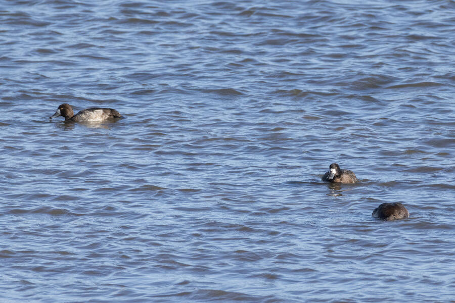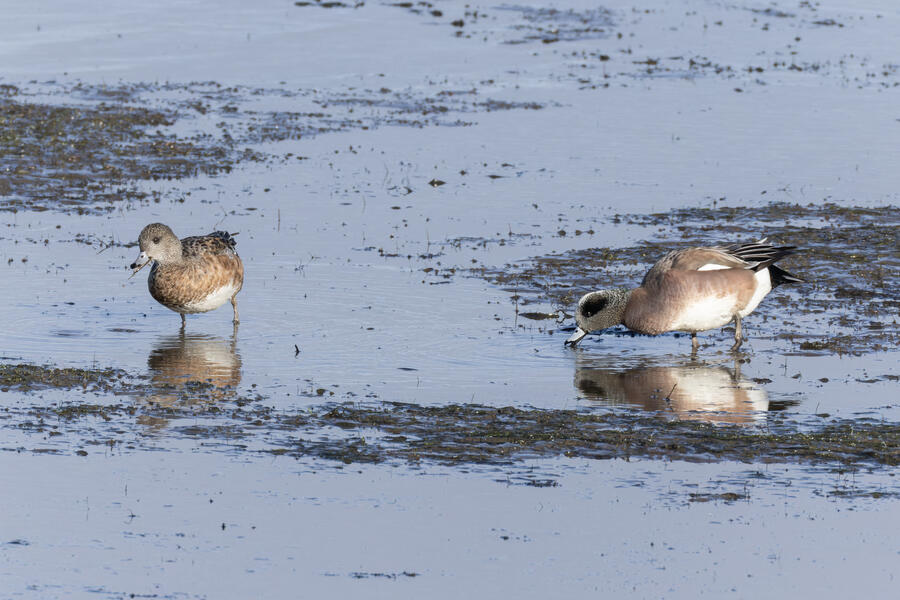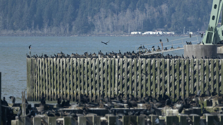 Double-crested Cormorant, Brandt's CormorantAs far as I could tell, of the hundreds of cormorants sitting and nesting on the bridge piers, just about all were Double-crested Cormorants and these couple dozen were Brandt's Cormorants. There's a plastic dummy falcon there, an ineffictive one I'd say, as well.