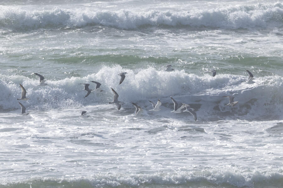 Short-billed GullI had looked ahead of time and knew there had been Short-billed Gulls seen often at this part of the Oregon coast. As I was heading toward the car I saw a group of gulls going by and took some photos. Sure enough, they were Short-billed Gulls with large white mirror spots on outer primaries, very small unmarked bills, and dark eyes. Those field marks all rule out Ring-billed, which is probably the most similar species they could have been. I don't see Short-billed that often so I'm happy to have taken these photos.