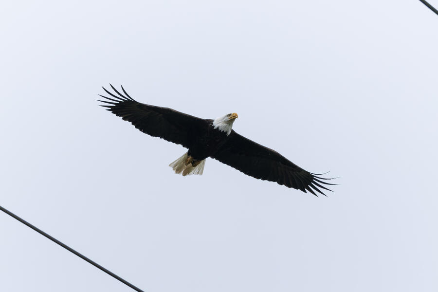 Bald EagleThis eagle came out of nowhere, up and over the ridge I was hiking up. I barely had time to realize what I was seeing and snap a photo. This frame worked nicely, between the power lines.